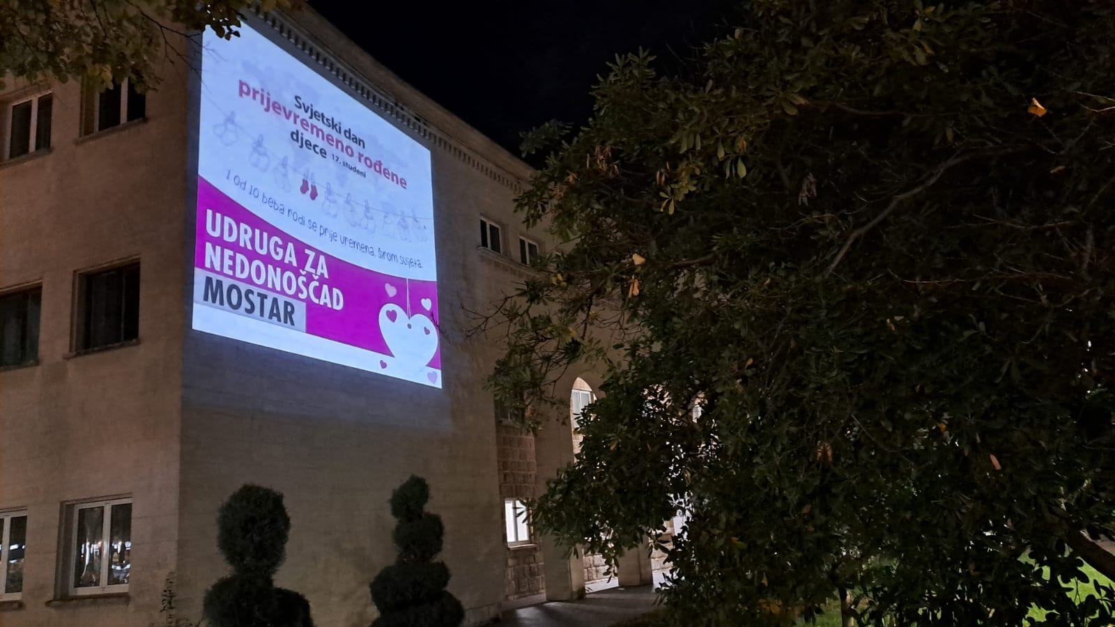 U povodu Svjetskog dana prijevremeno rođene djece, u zgradi Hrvatskog doma hercega Stjepana Kosače u Mostaru projicirana je simbolična poruka podrške i podizanja svijesti o izazovima i važnosti brige za prijevremeno rođene bebe. Ovaj poseban dan, koji se obilježava 17. studenoga, naglašava činjenicu da se svaka deseta beba diljem svijeta rodi prije vremena, a cilj je skrenuti pozornost javnosti na ovu osjetljivu temu. Organizaciju događaja podržala je Udruga za nedonoščad Mostar.